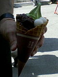 外で抹茶のソフトクリームを食べました。