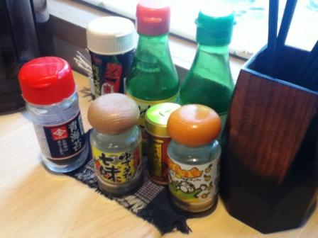 テーブルの上に、いろんな種類のゆず(液体と顆粒、粉末)と青のり、七味。