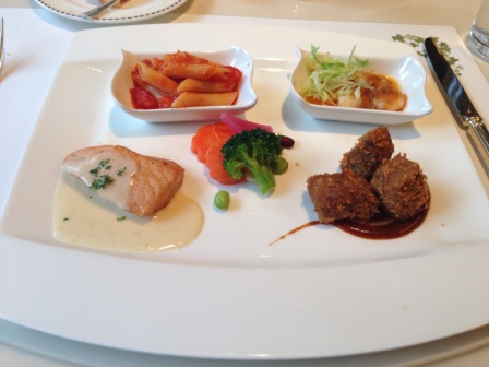 サーモン、ステーキのコロッケ、ペンネアラビアータ、エビの中華風?